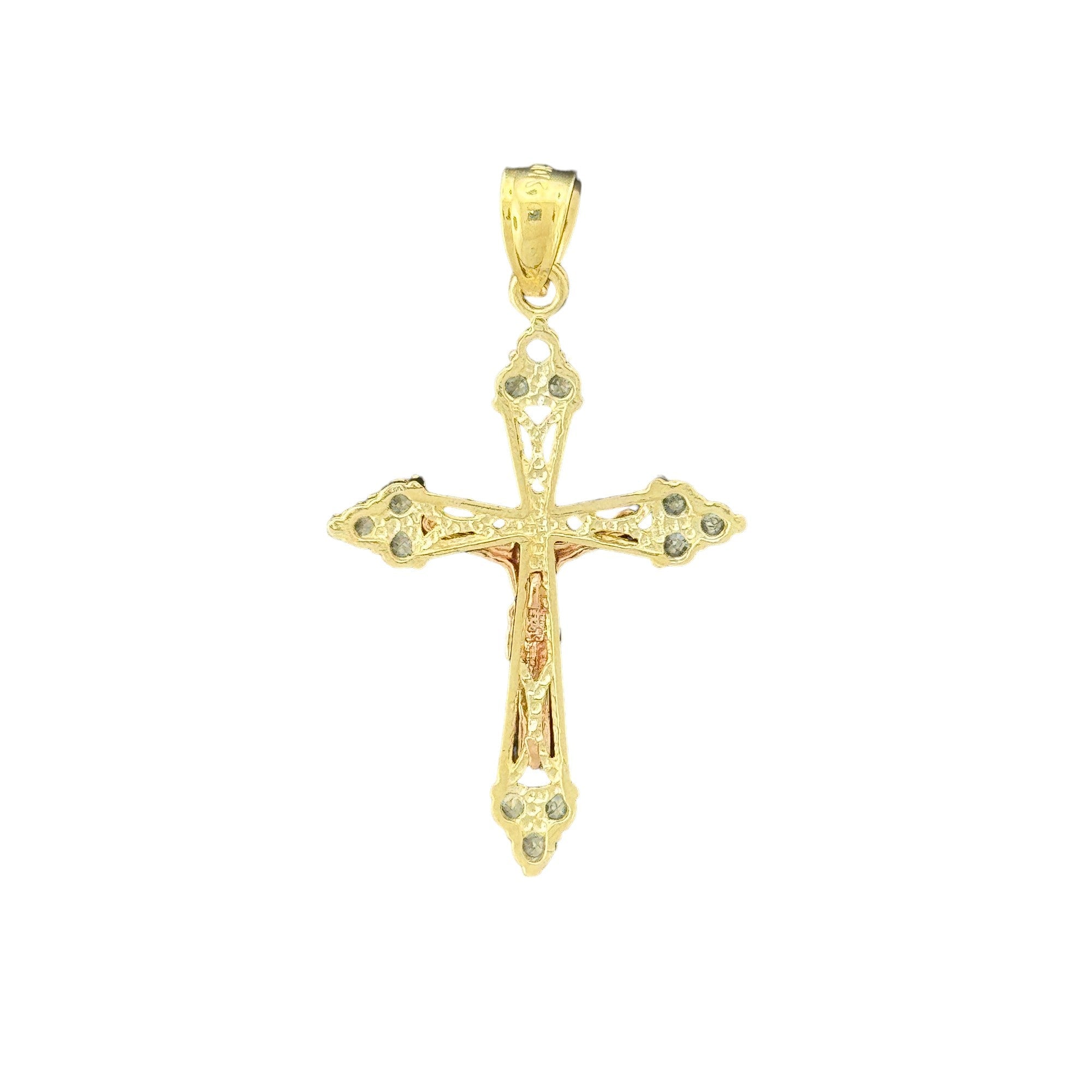 Design: Two-tone crucifix with detailed corpus and CZ stones