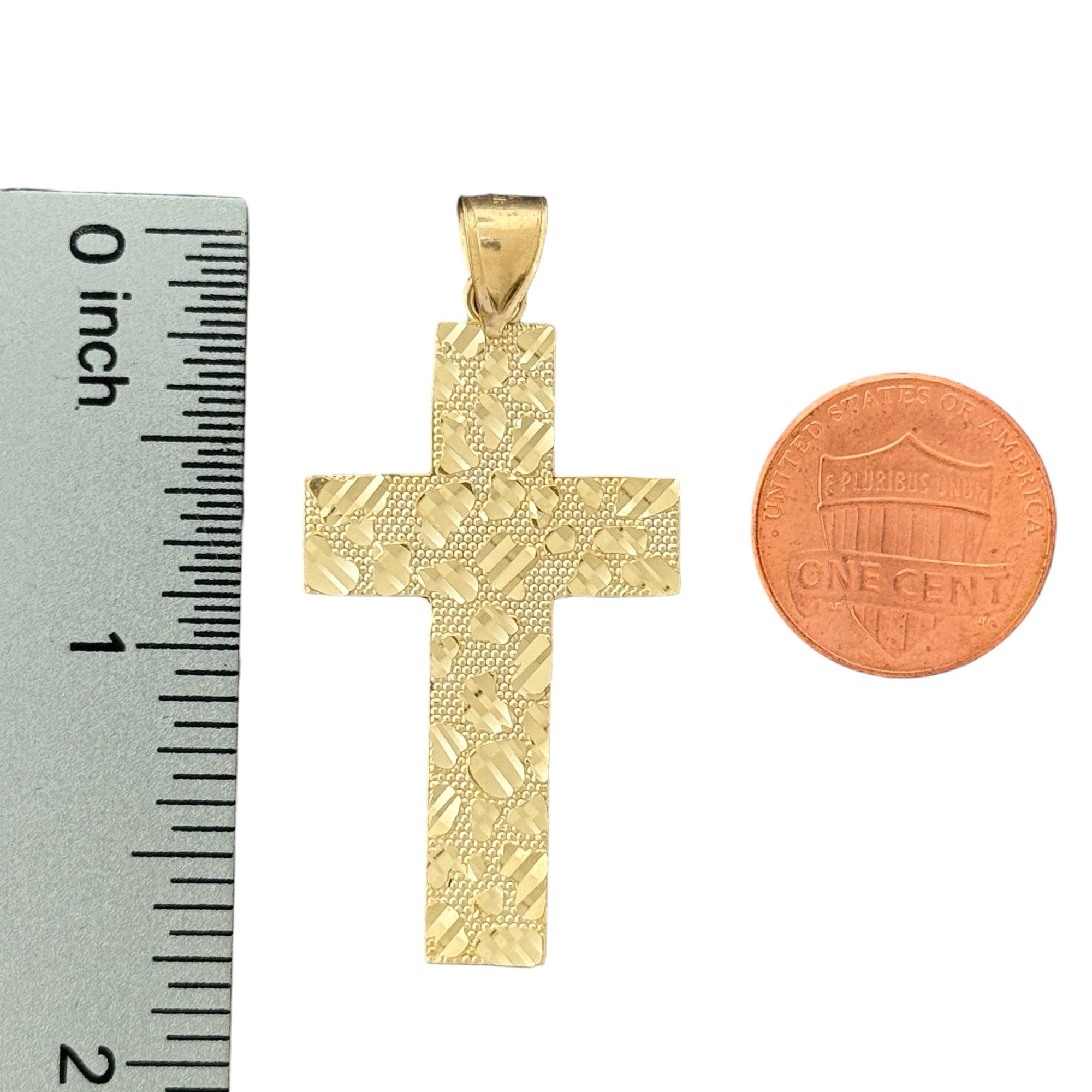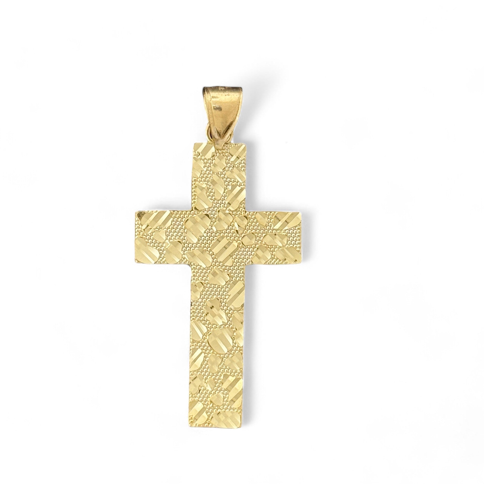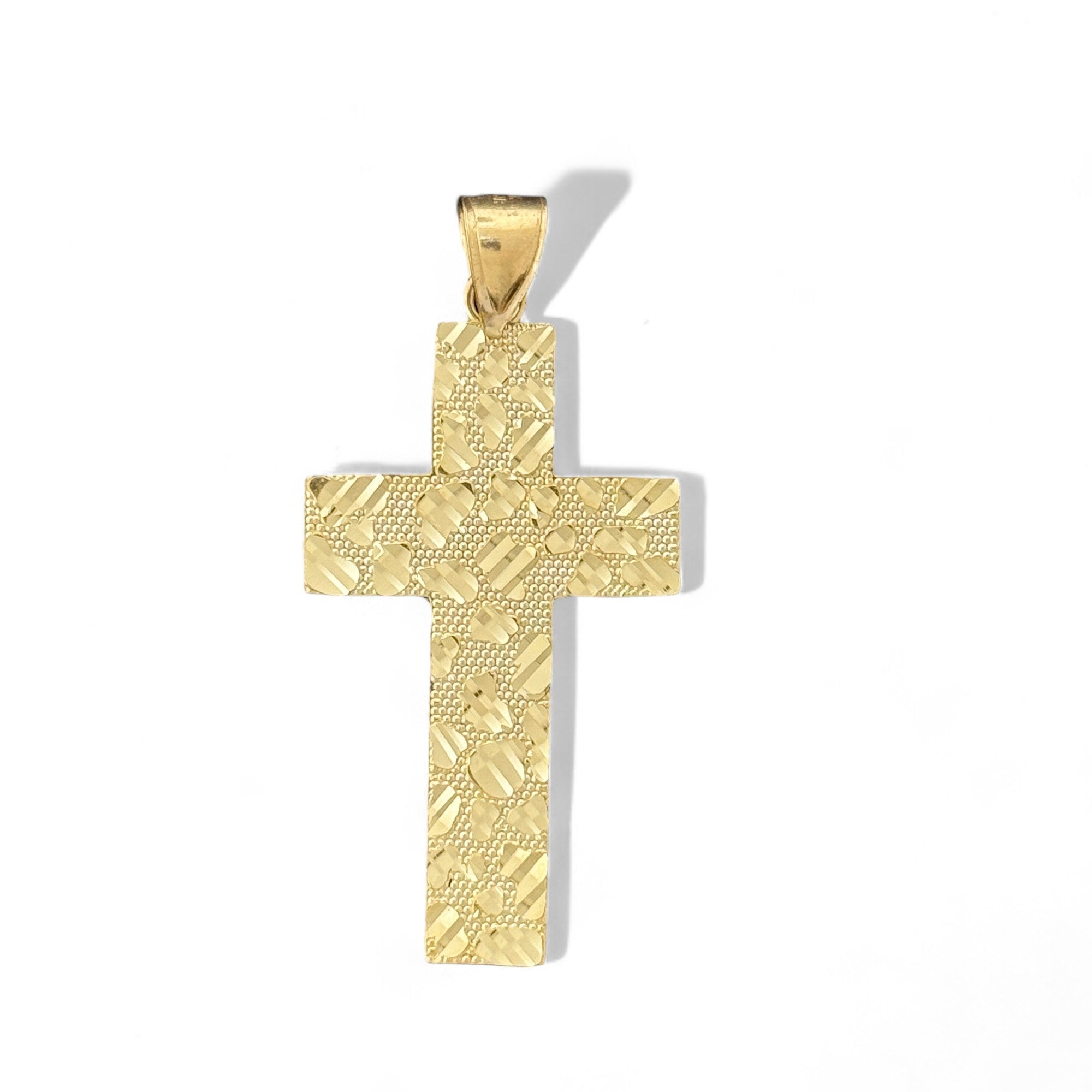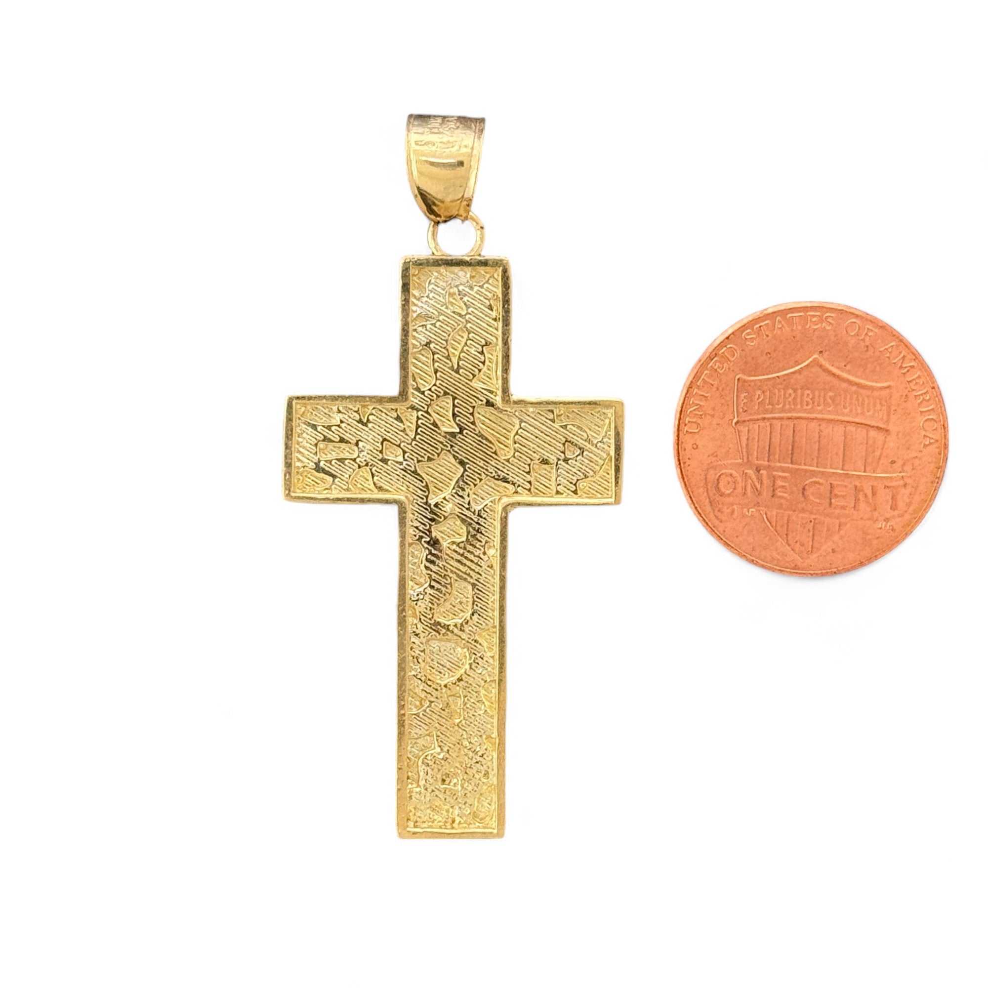 This 10KT Yellow Gold Cross Pendant is a bold and striking piece, featuring an embossed design that enhances its visual appeal. Weighing 4.4 grams and designed with a 5mm bail, this pendant is perfect for those who appreciate substantial and well-crafted jewelry. The embossed details make it a standout accessory.