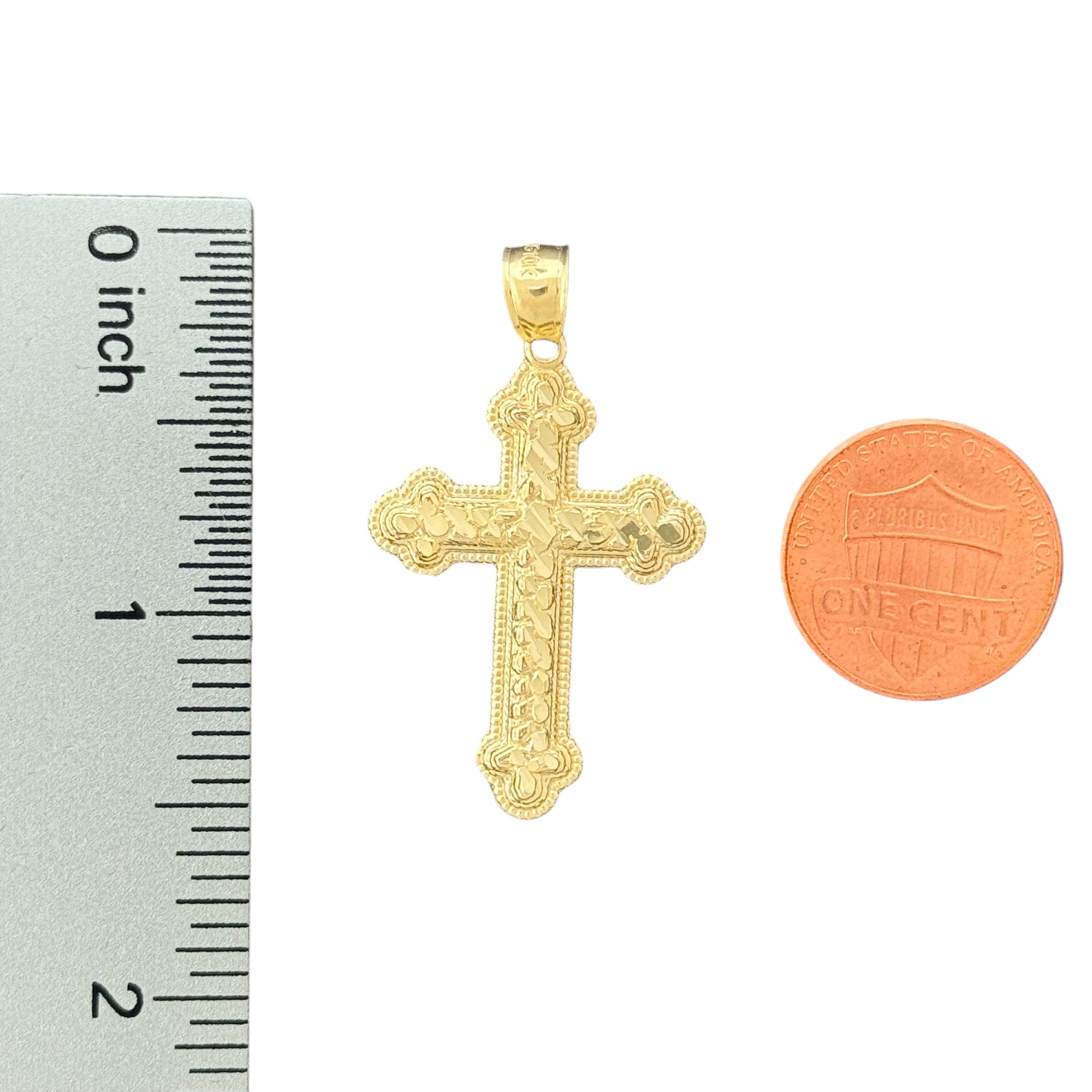 This exquisite 10KT Yellow Gold Cross Pendant features an ornate design, combining elegance with intricate detailing. Weighing 1.62 grams and equipped with a 3mm bail, this pendant is perfect for those who appreciate fine craftsmanship and timeless beauty. The ornate patterns add a touch of sophistication to the classic cross shape.