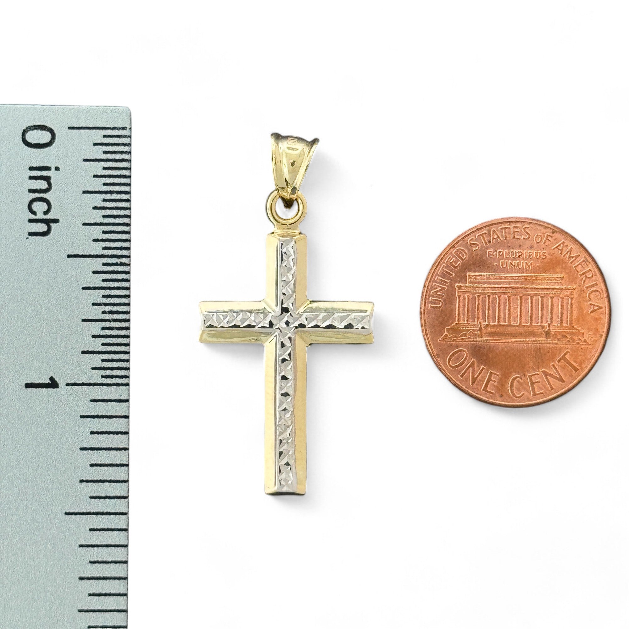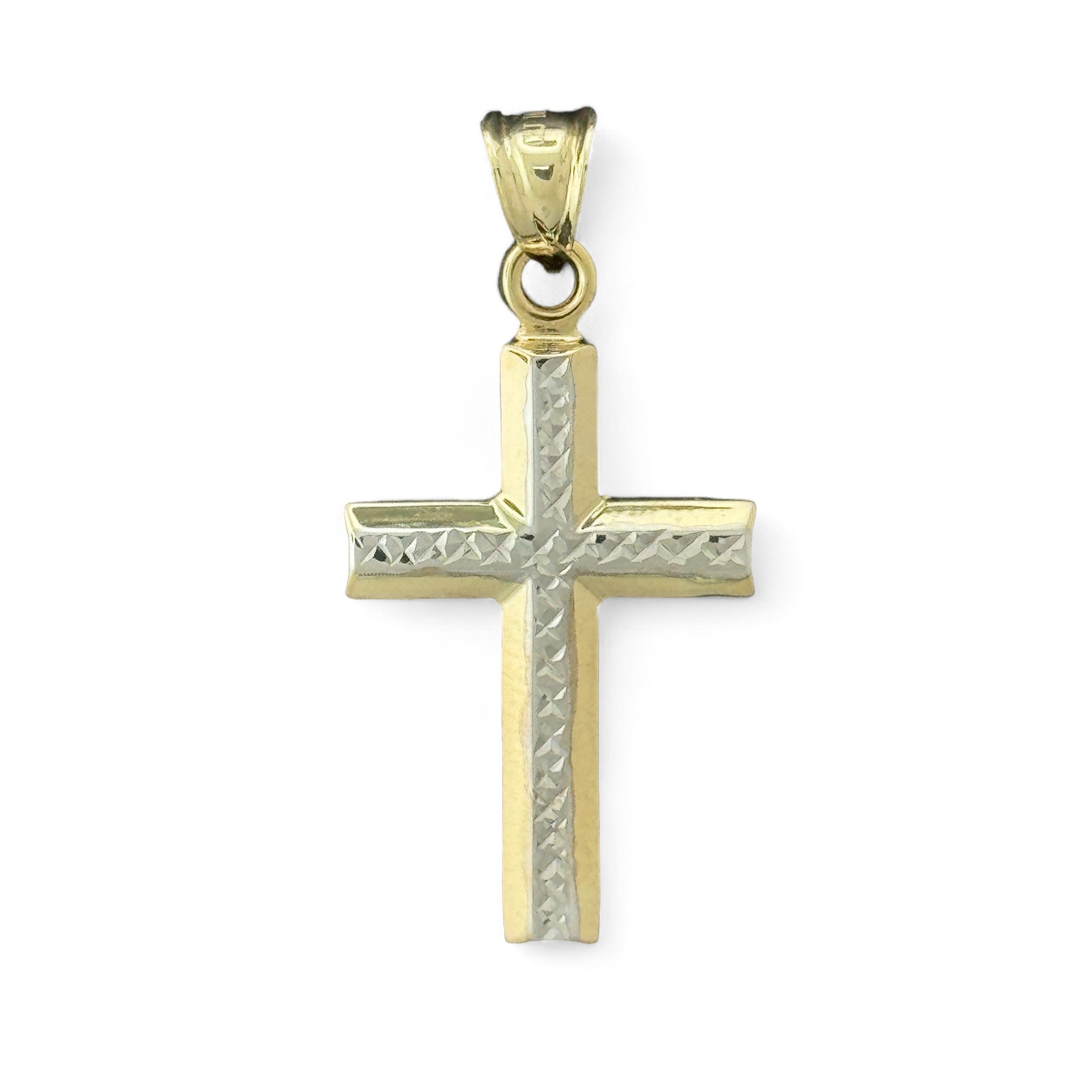Celebrate faith with our 10KT Two-Tone Gold Cross Pendant. This beautifully designed cross features both yellow and white gold with a high-polish finish and intricate detailing. Perfect for both men and women, this pendant is a timeless symbol of devotion.