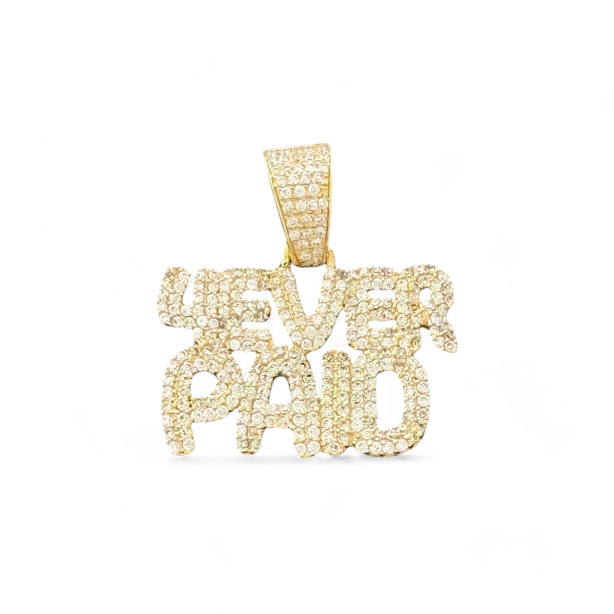 Make a bold statement with this 10KT Yellow Gold "Never Paid" Pendant, weighing 3.61 grams with a 4mm bail. This piece is encrusted with cubic zirconia for added sparkle, perfect for those who live life on their own terms.