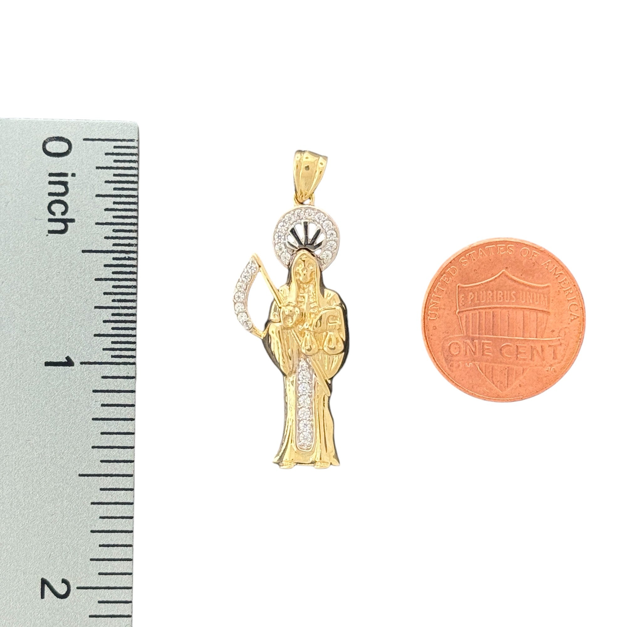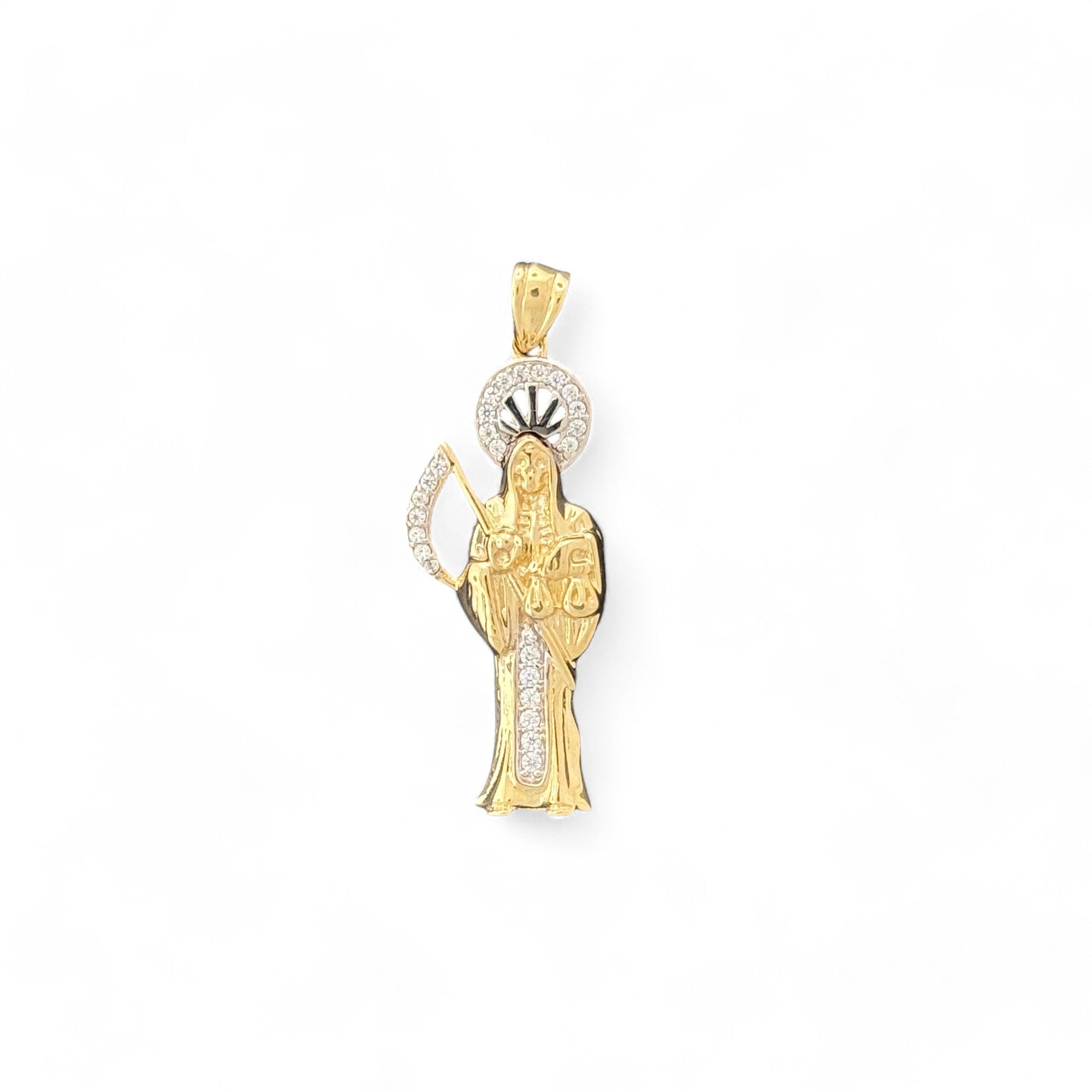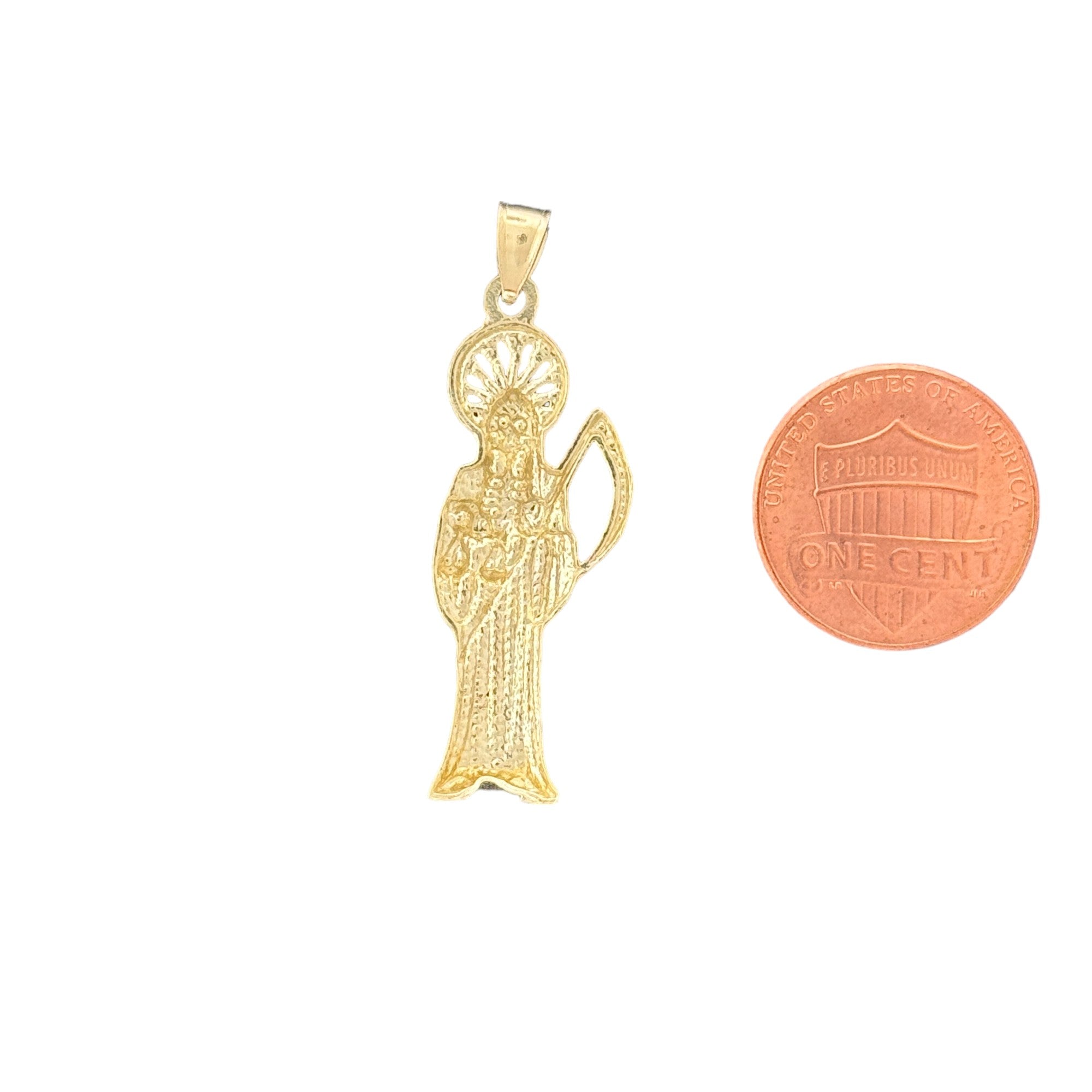This stunning 10KT Yellow Gold Santa Muerte Pendant features sparkling details that enhance the intricate design. Weighing 2.06 grams and equipped with a 2mm bail, this pendant is a perfect blend of beauty and spirituality.