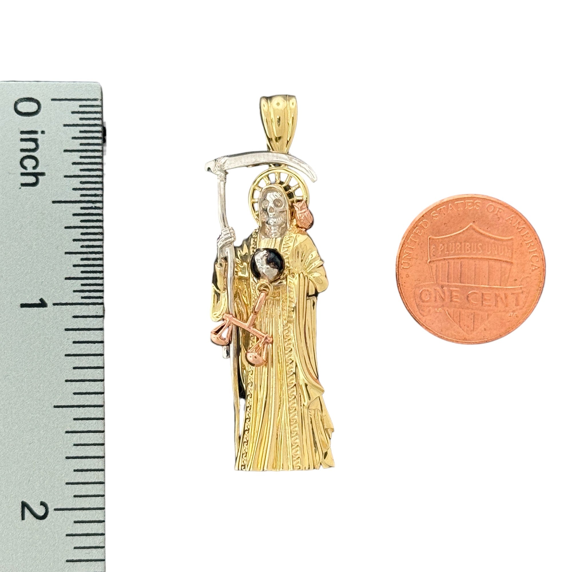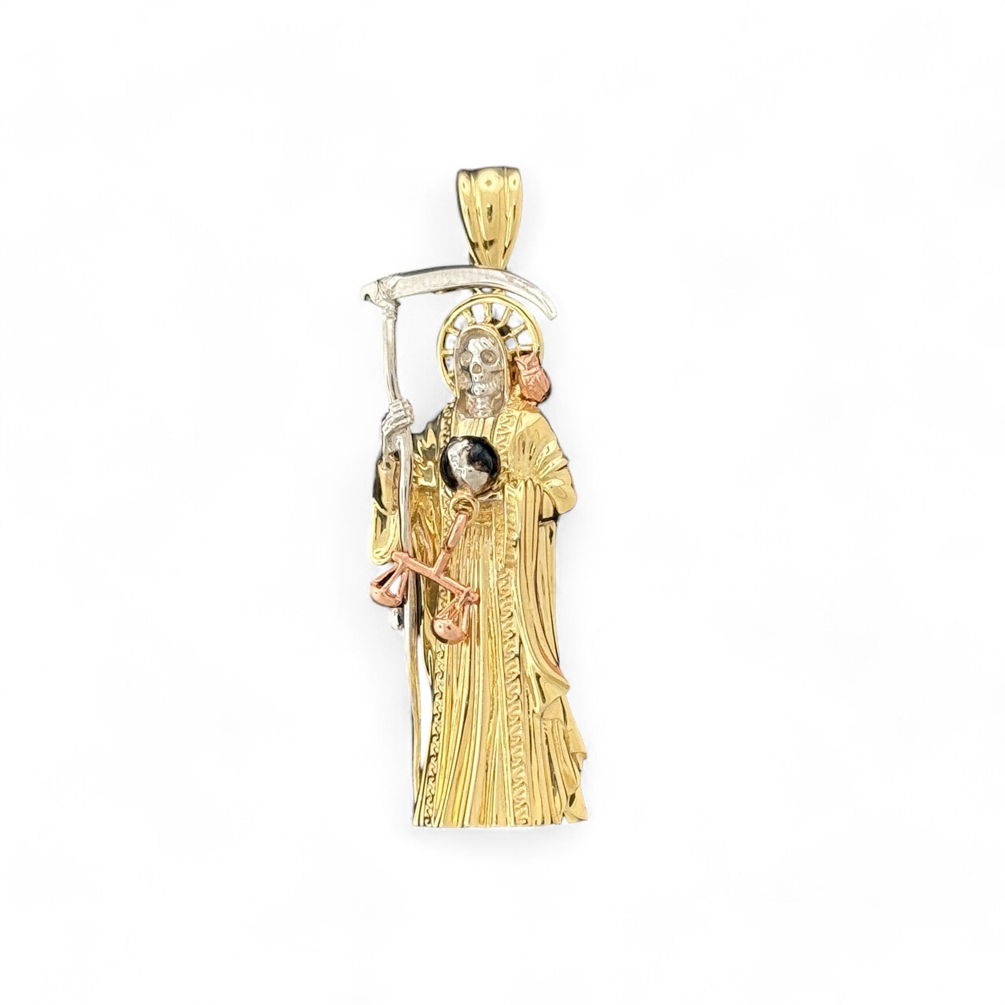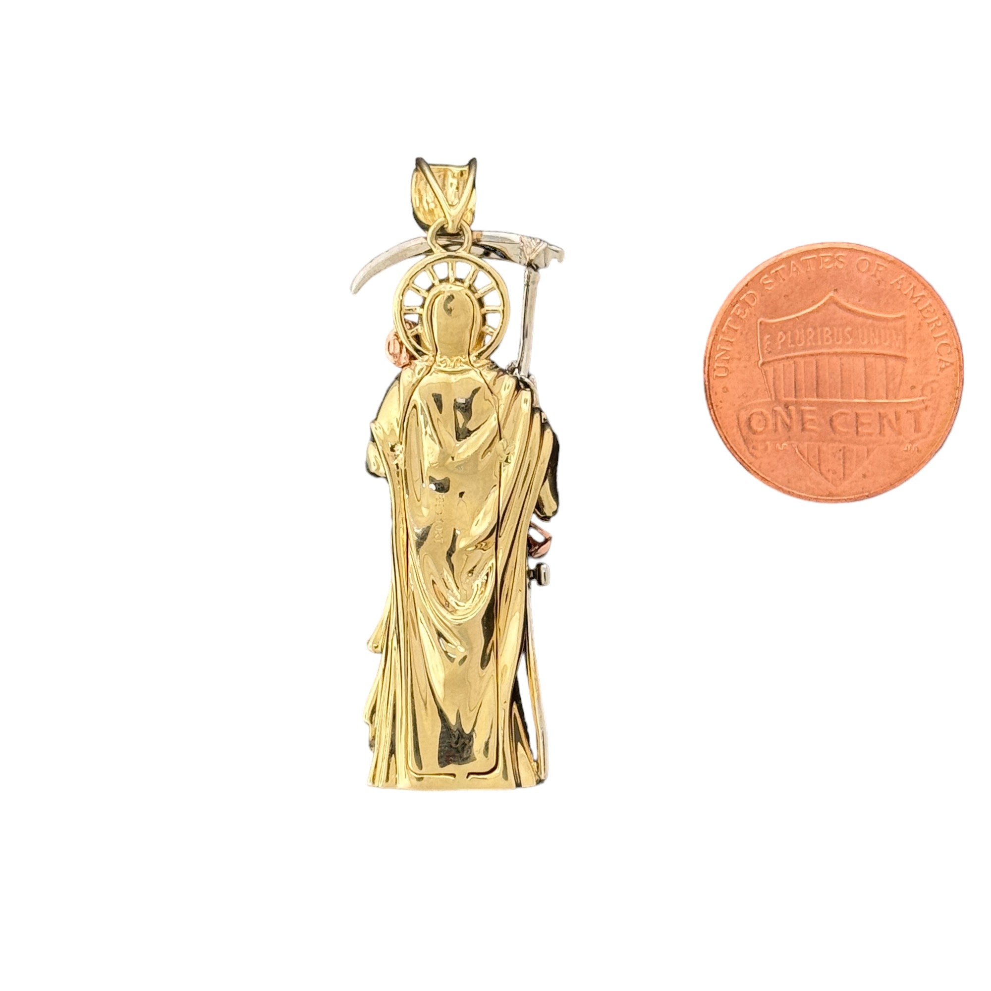 This bold 10KT Yellow Gold Santa Muerte Pendant showcases a striking tri-color design, combining yellow, white, and rose gold elements. Weighing 8.71 grams and featuring a 3mm bail, this pendant is ideal for those who appreciate unique and substantial jewelry pieces.