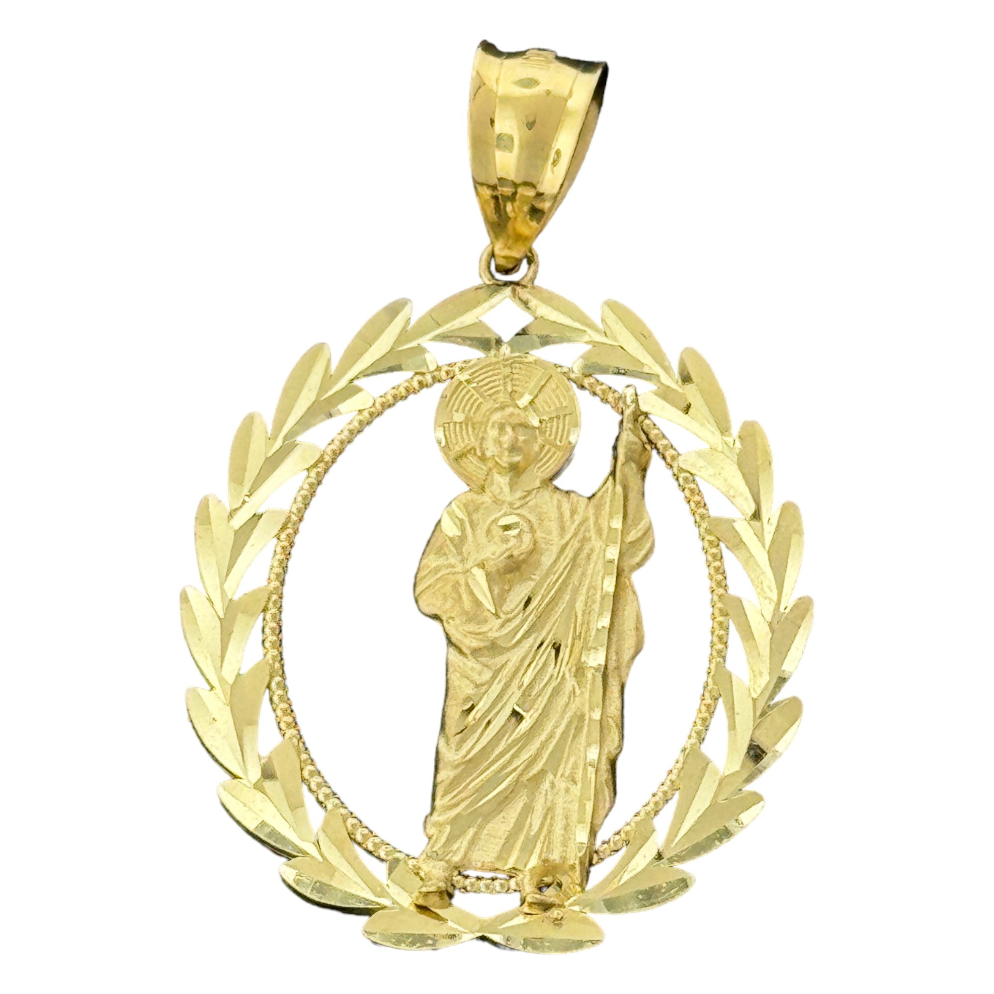 - Design: Round Saint figure with sparkling CZ stones