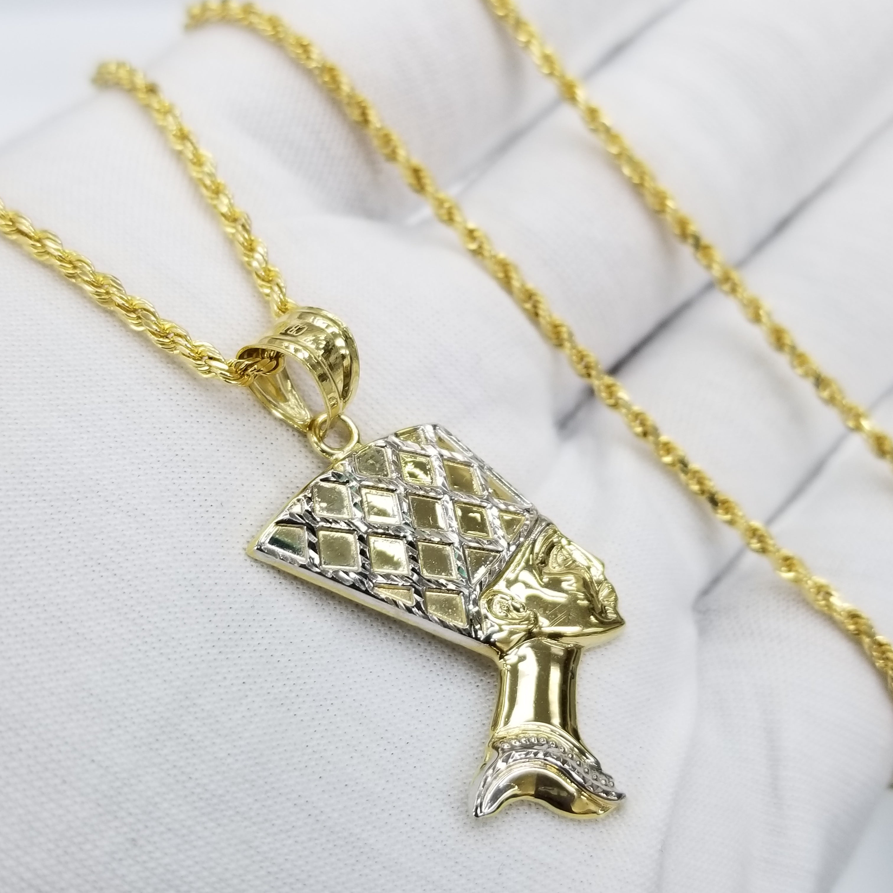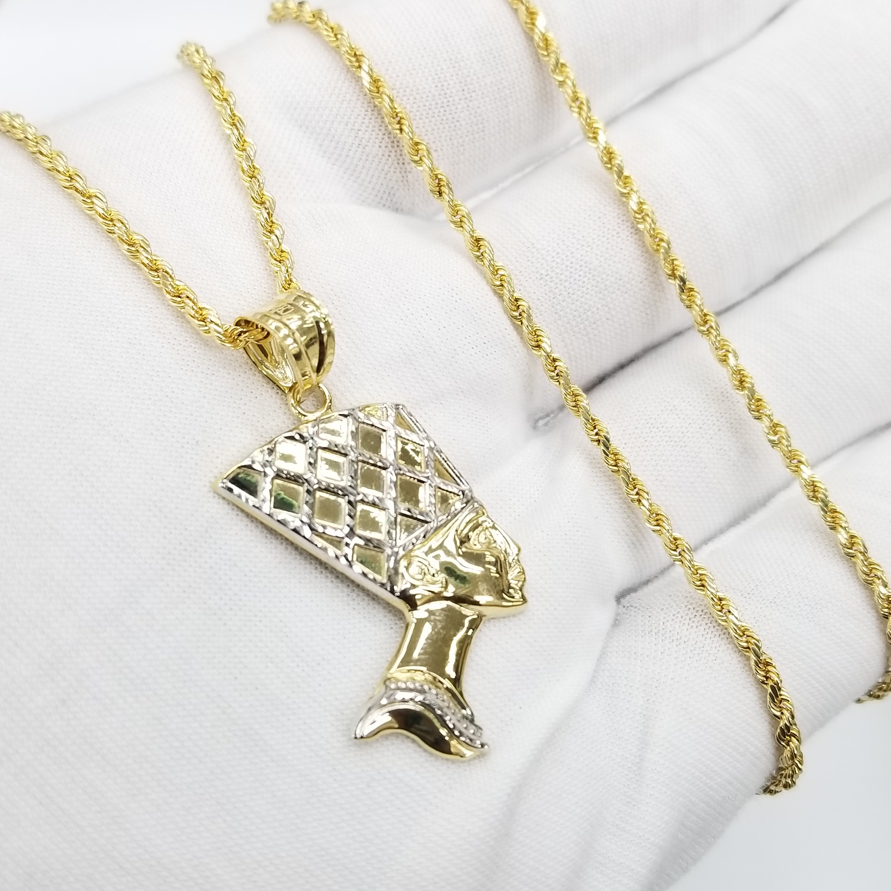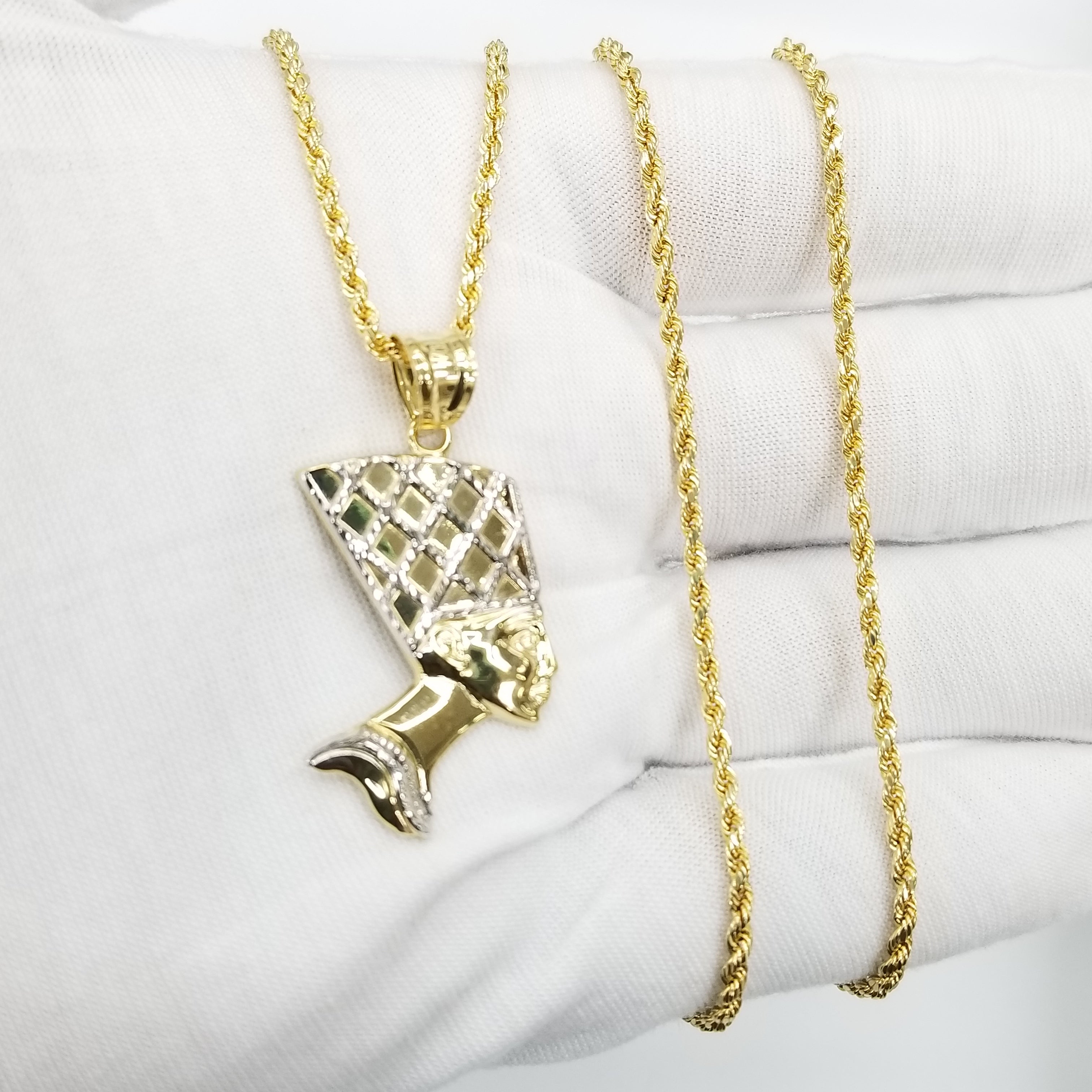 Rope Necklace with Nefertiti Pendant 10K Real Gold